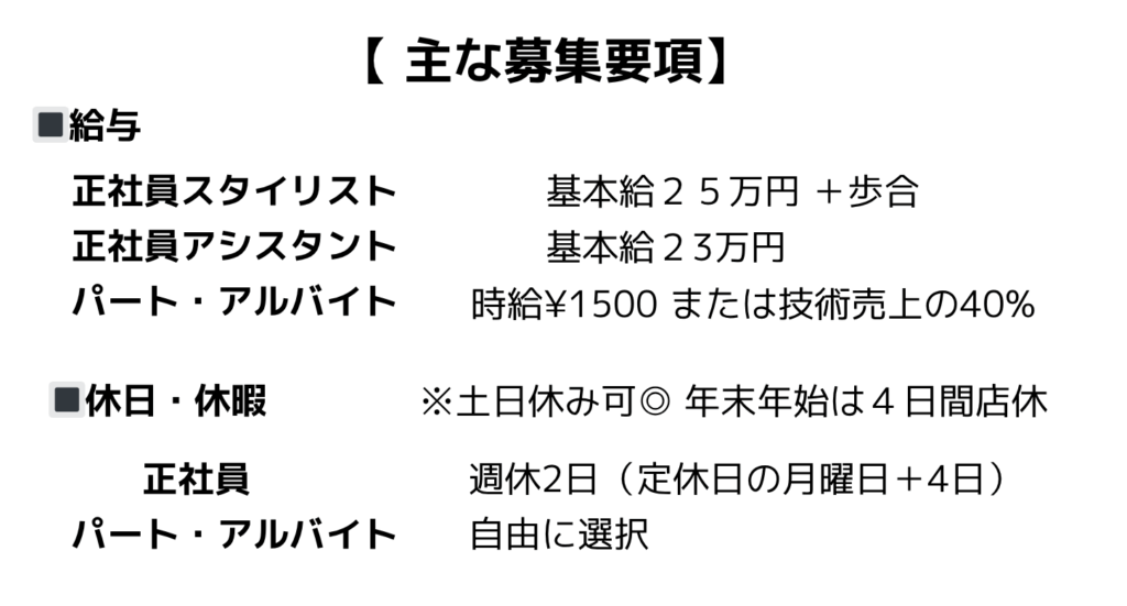 HOME シャンプー・カラーができればOK! アシスタントとして働きたい方は「シャンプー」「カラー」この内容ができれば大丈夫です!スタイリストで技術が不安な方はメニューを限定しての働き方もできるので1度ご相談ください♪ LINEから相談する LINEから相談してみる LINEから相談してみる